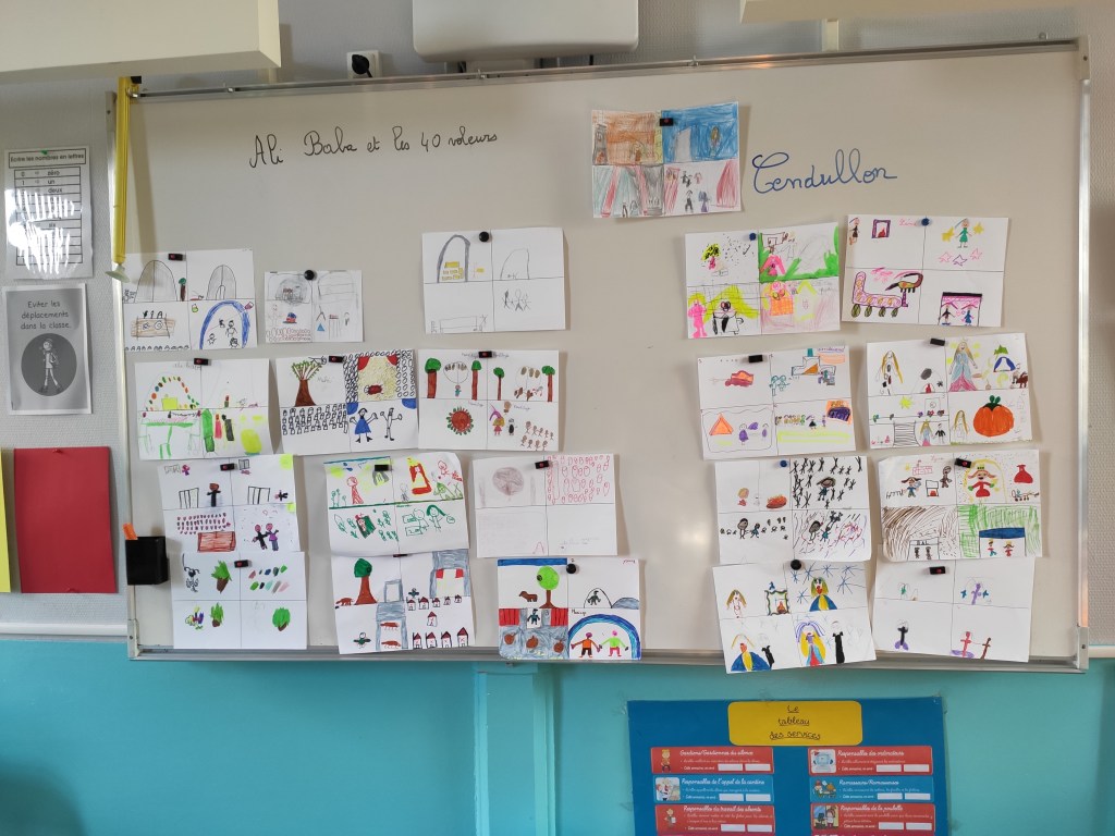À l’école nous avons lu des contes puis nous avons voté pour choisir celui qu’on voulait illustrer. Deux contes ont gagné : « Ali Baba et les quarante voleurs » et « Cendrillon ».