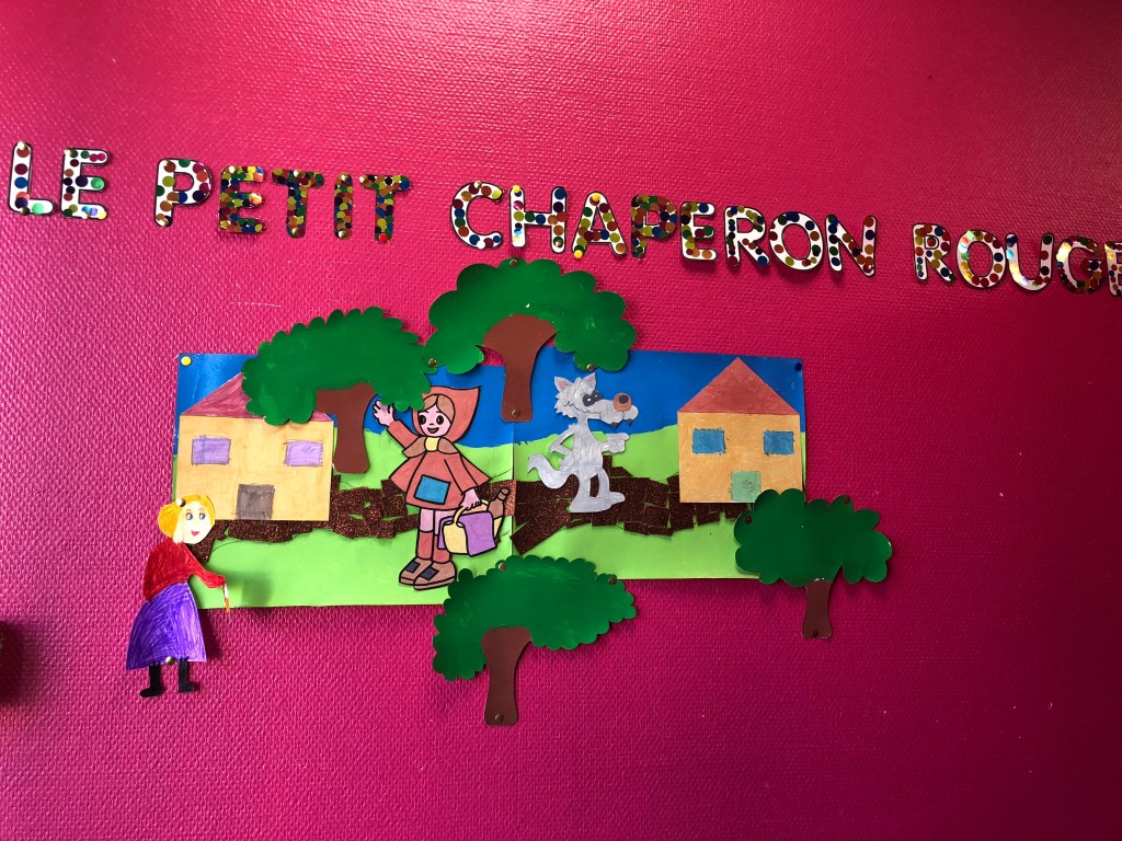 Au cours de cette deuxième période, nous avons travaillé sur les contes à travers l’album « Le loup qui découvrait le pays des contes ». Nous avons réalisé différents affichages des contes vus en classe: les trois petits cochons et le petit chaperon rouge.