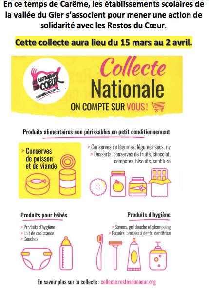 En ce temps de Carême, des établissements scolaires privés catholiques de la Vallée du Gier dont le nôtre, s’associent pour mener une action de solidarité avec les Restos du Cœur.