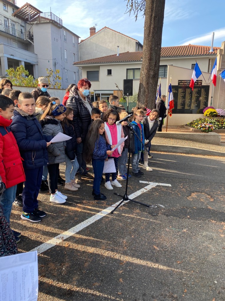 Le vendredi 12 novembre 2021, nous avons assisté à la commémoration du 11 novembre 1918 au monument aux morts de St Julien. Pour l’occasion, nous avons lu des lettres de poilus et d’enfants de poilus puis chanté La Marseillaise. Après la cérémonie, un sac de goûter ainsi qu’un diplôme nous ont été remis par la mairie de Saint-Chamond.