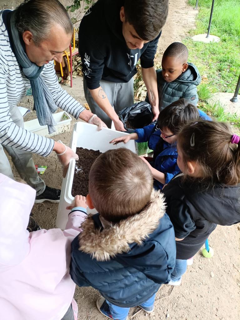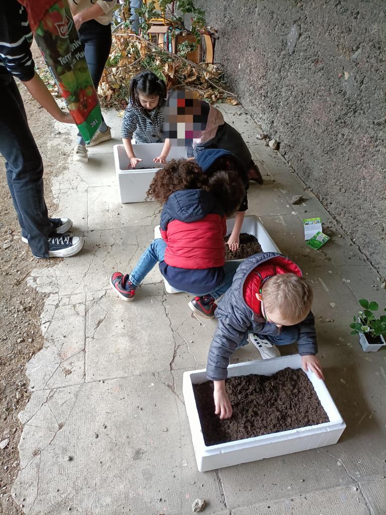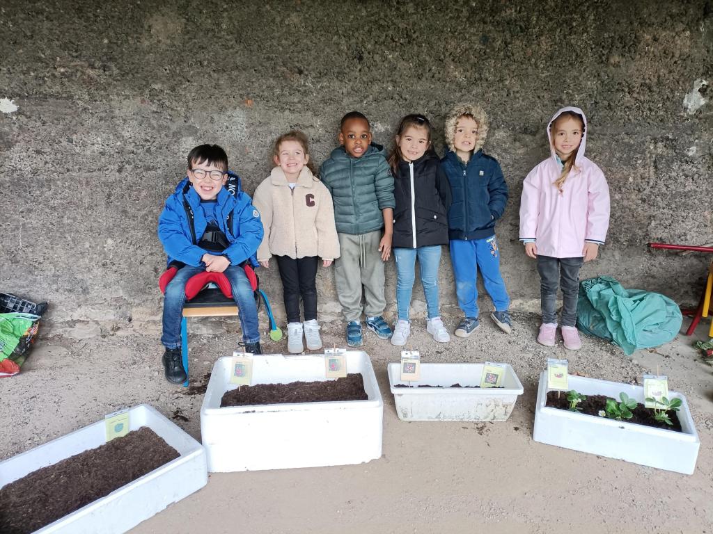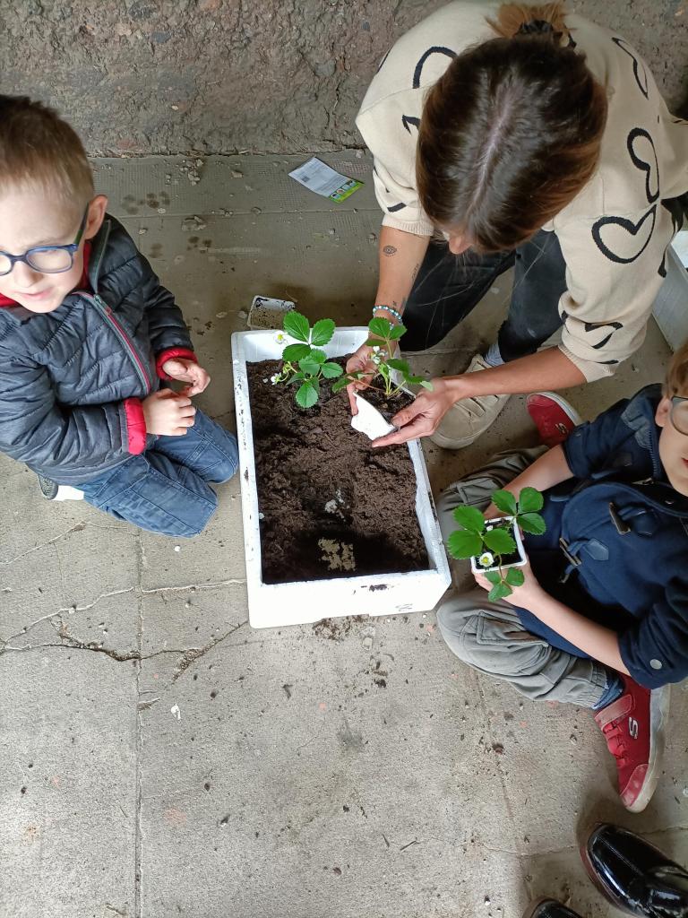 La première après-midi ils ont proposé aux élèves une activité de jardinage : plantations de fruits (fraises) et légumes (radis, salades).