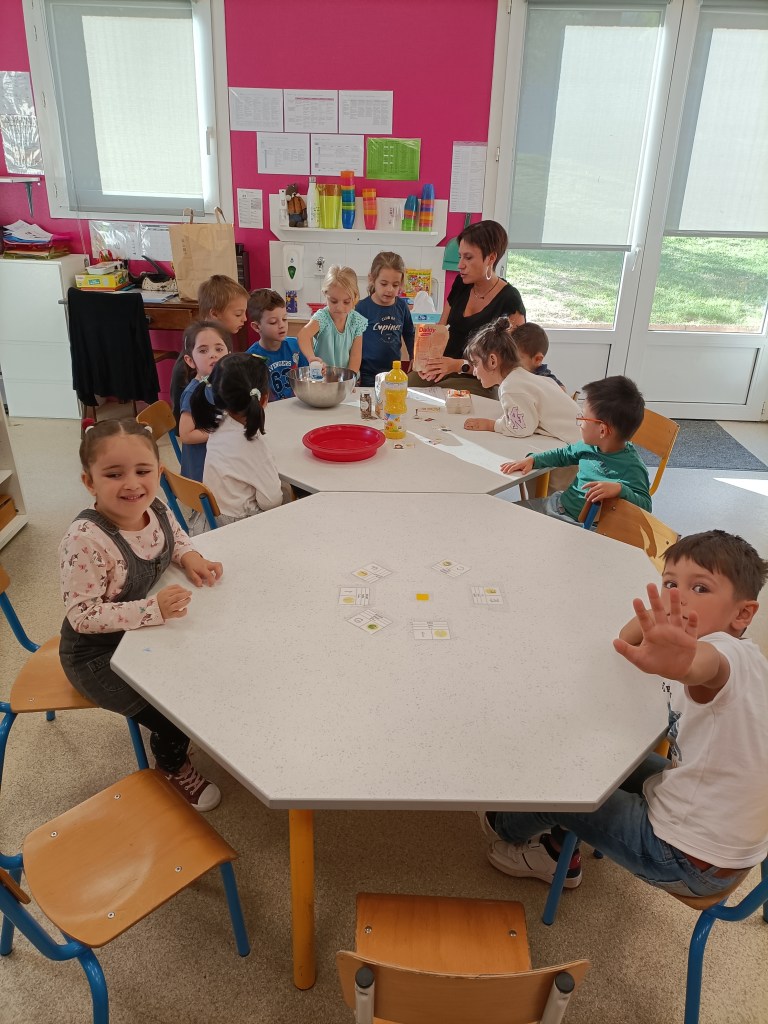 Le matin, ils ont cuisiné en classe tous ensemble. Ils ont fait deux gâteaux: un gâteau au yaourt nature et un gâteau au yaourt avec du cacao.